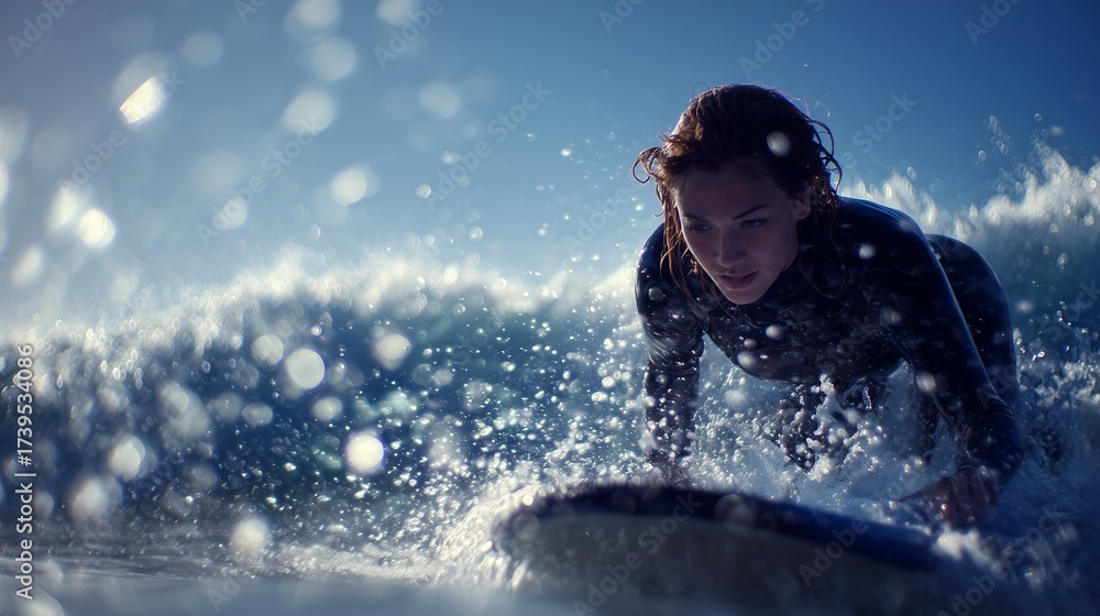 A woman leans forward on the surfboard as the woman navigates through splashing waves. The woman balances while waves crash around the surfboard under bright light. #1739534086