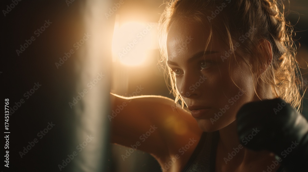 A woman practices boxing with intense focus on a punching bag as the woman directs her energy. Light from the side highlights the woman’s movement with the punching bag. #1745137768