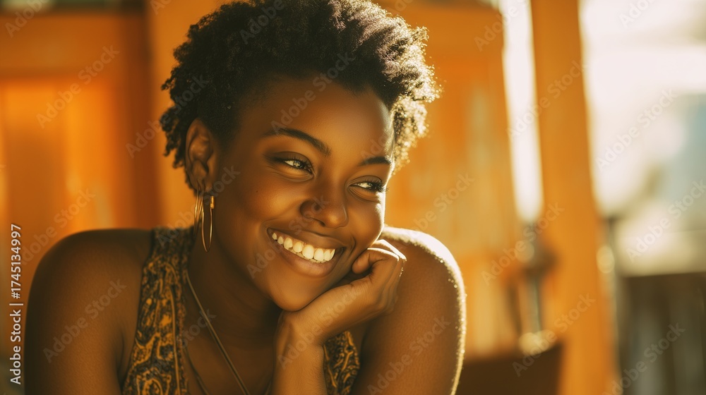 A woman with curly hair is seated in a sunlit room, with the light illuminating her curly hair. The woman appears relaxed in the warm ambiance provided by the sunlight. #1745134997