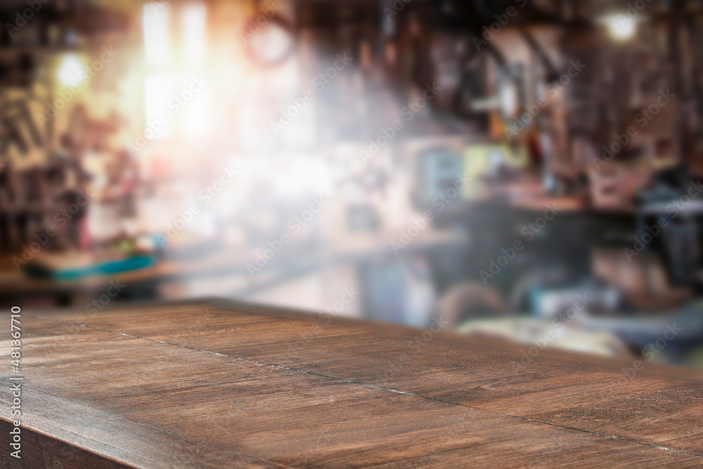 A wooden table with a vacant space and the interior of a repair shop in the background #481367710