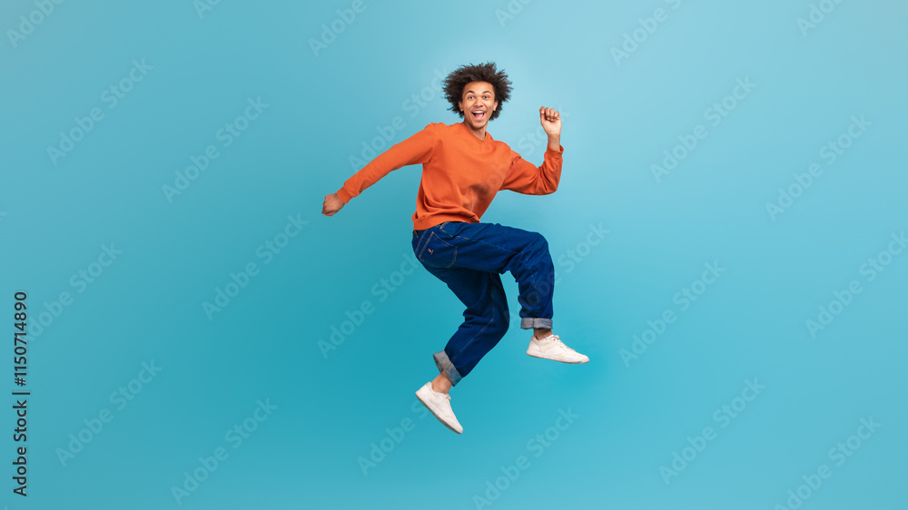 A young African American man with curly hair is jumping joyfully against a vibrant blue background. He is wearing a casual orange sweater and blue jeans, exuding youthful energy and enthusiasm. #1150714890