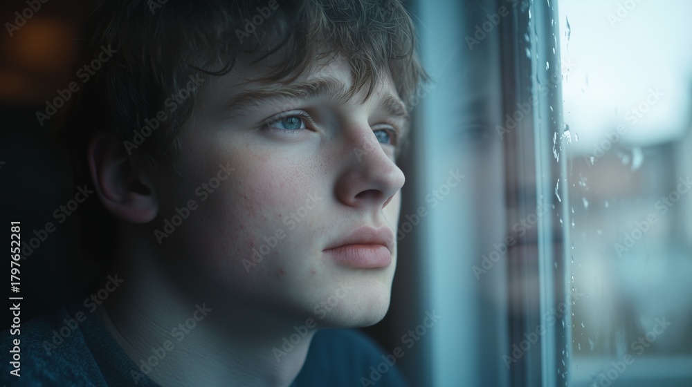 A young boy stares out the window, watching the raindrops cascade down the glass with curiosity. The boy's thoughtful gaze reflects on the calmness of the rainy day outside. #1797652281