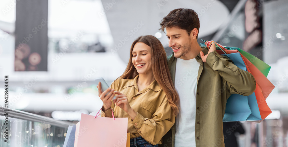 A young couple is at a mall looking at their phone while holding shopping bags. They appear happy and engaged with each other. The mall is busy with other shoppers around them. #1942868458