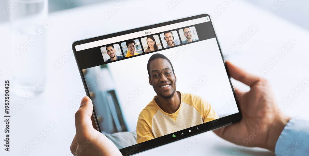 A young doctor is engaged in an online consultation. He holds a tablet with a video call on the screen featuring a smiling patient. The setting is a bright room with a white table. #1957590425
