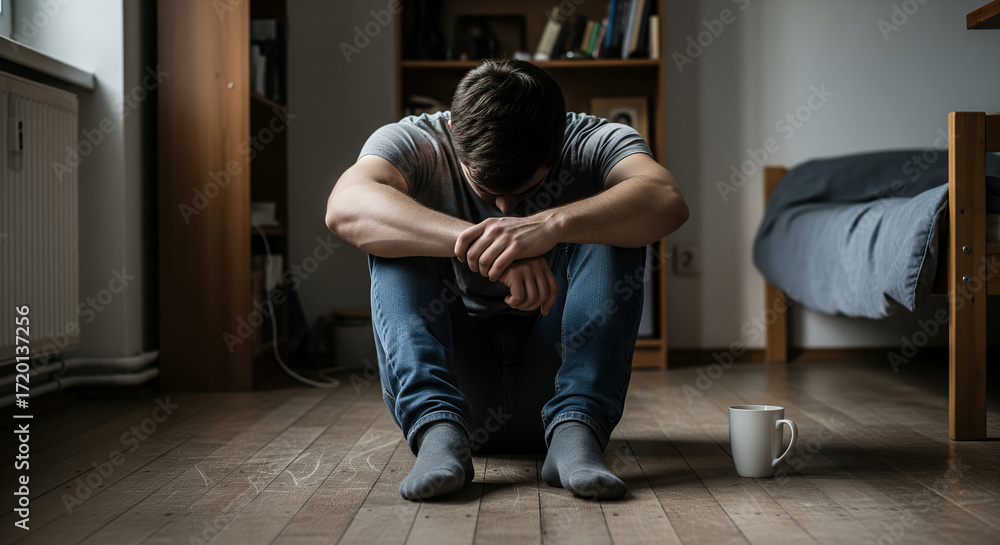 A young man sits on the floor of a dimly lit room, hunched over with his head in his arms, conveying feelings of sadness and despair. #1720137256