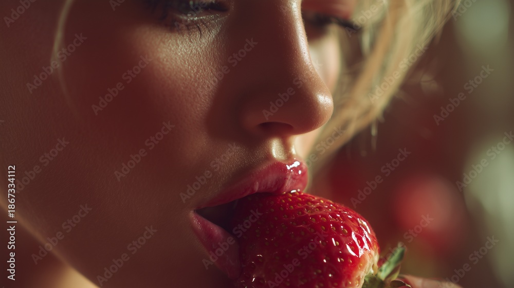 A young woman gently holds a ripe strawberry, preparing to enjoy its flavor. The colorful strawberry contrasts with the soft backdrop, drawing attention to her expression of deligh #1867334112