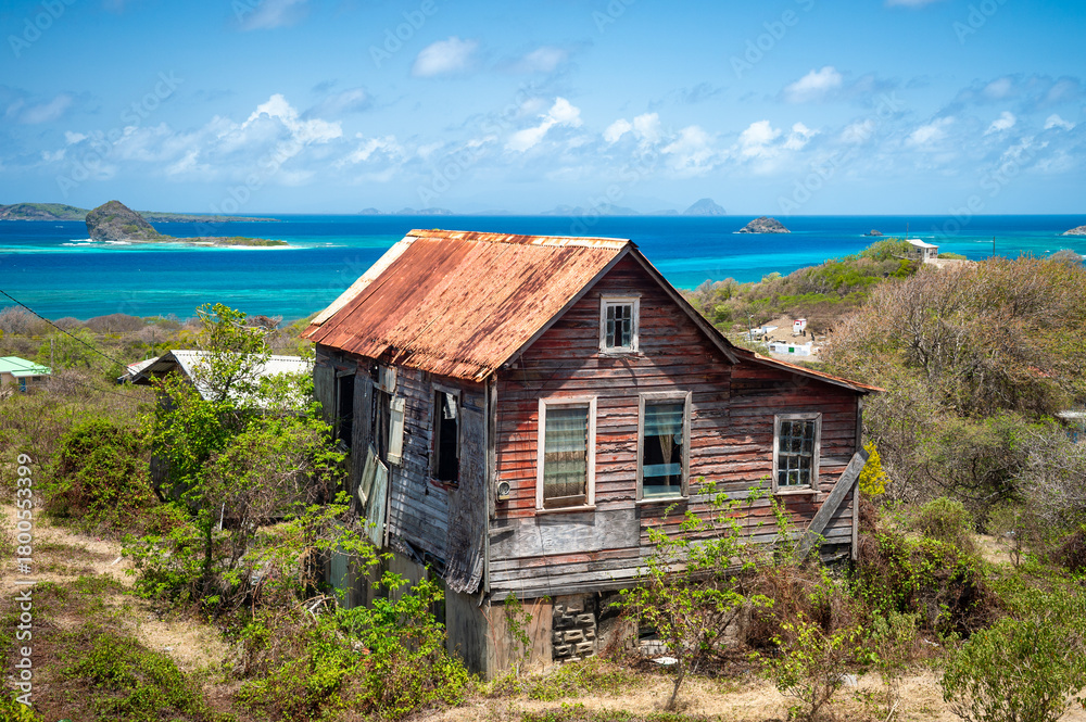 Abandoned and derelict traditional wooden clapboard cottage on Carriacou, Grenada #1800553399