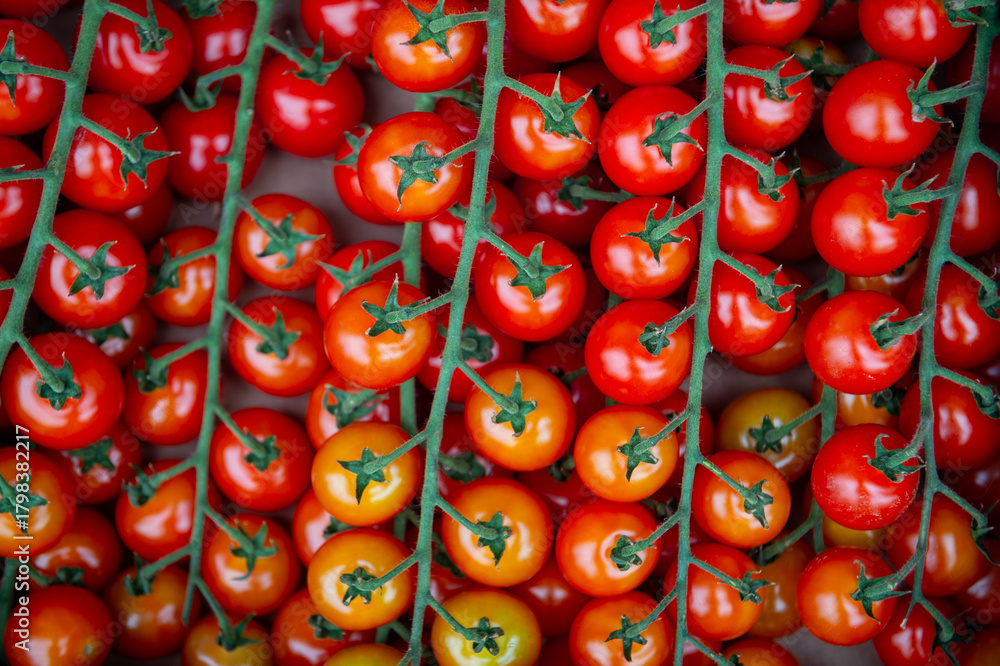 Abstract background of rows of red cherry tomatoes on the vine #1798382217