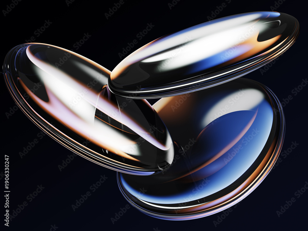 Abstract black background with liquid glass circle discs, inflatable 3D shapes. Crystal light holographic circular disks, iridescent transparent lens with gold blue neon gradient. 3D illustration #1906330247