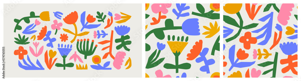 Abstract colorful flower drawing illustration set. Funny children art style floral doodle cartoon pattern collection, hand drawn basic nature shapes on isolated background. #574765055