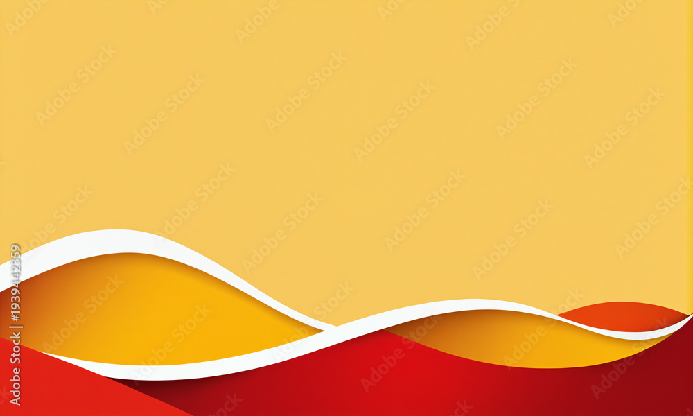 abstract composition with red and orange waves at the bottom and a solid yellow top section with white curved bands and bright crimson accents. #1939442359
