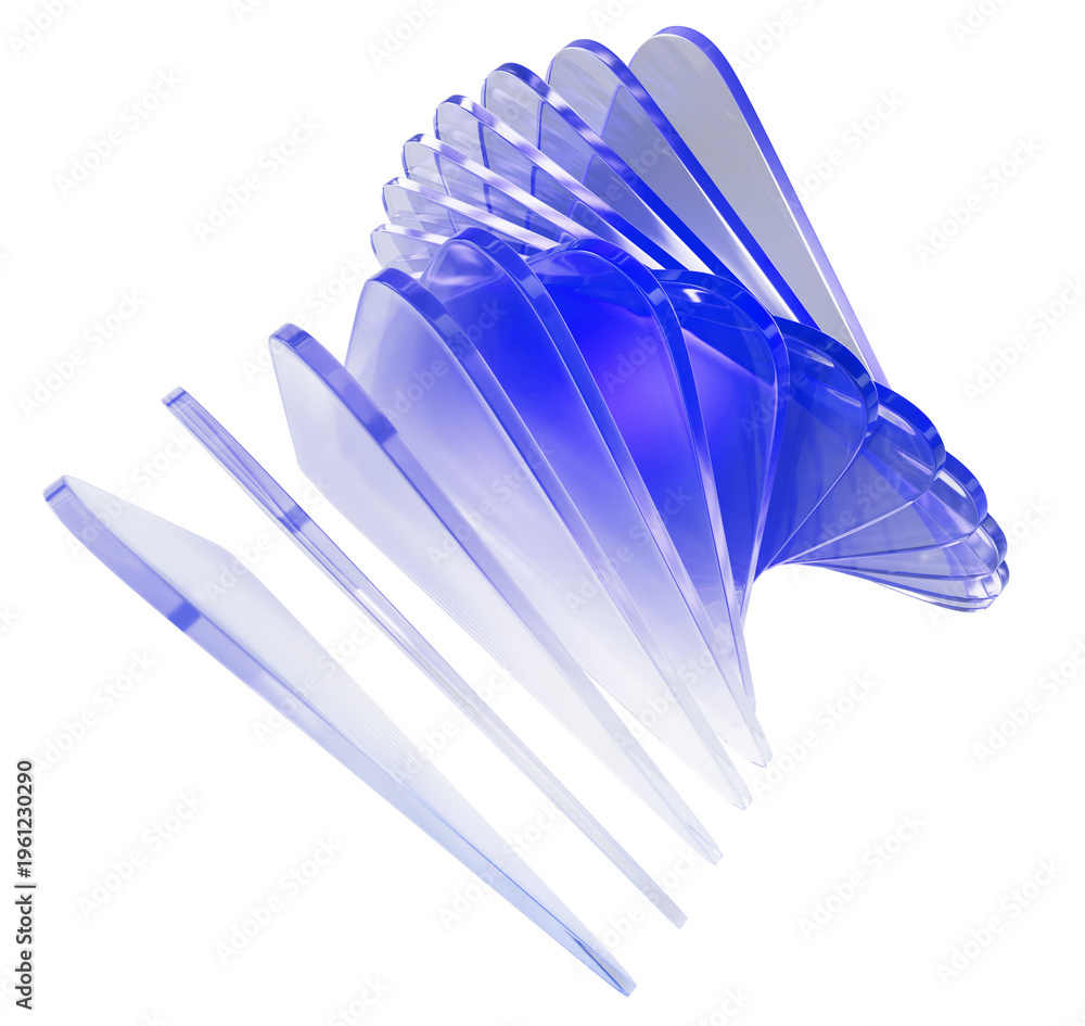 Abstract 3d glass layered effect with light purple blue gradient. Line array, twisted transparent form render. Swirl of crystal triangle plate shapes. Isolated graphic design element #1961230290