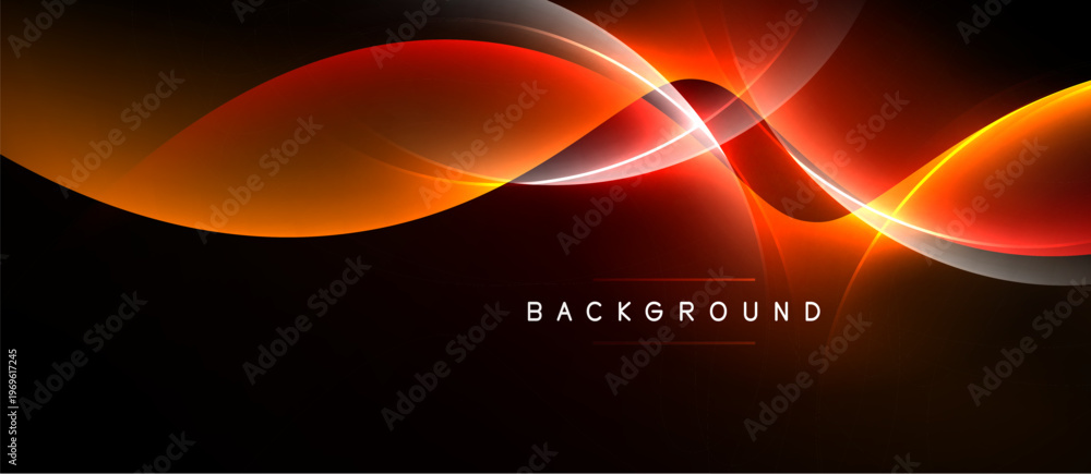Abstract design features vibrant orange, red curves against black backdrop. Dynamic lines create flowing, modern visual impact. #1969617245