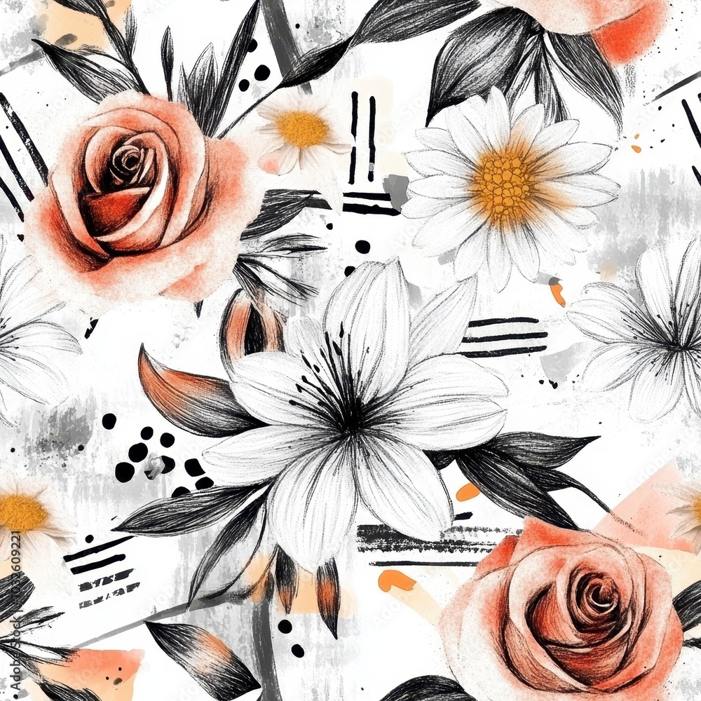 Abstract Floral Pattern with Roses and Lilies on Textured Background #1032609221
