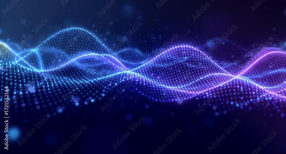 Abstract futuristic background with glowing, flowing blue and purple energy waves made of digital particles. Symbolizes data, sound, and modern technology. A vibrant and dynamic composition #1721552144