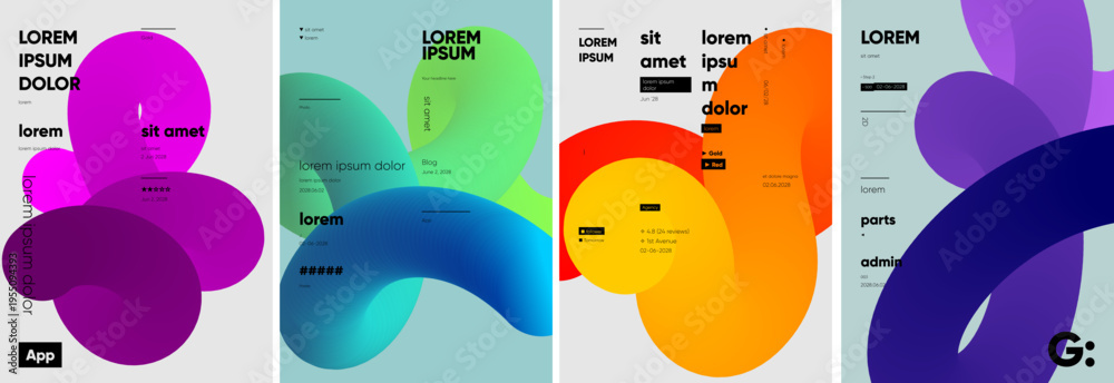 Abstract geometric design featuring vibrant overlapping shapes in pink, blue, green, and orange hues. Modern typography complements the dynamic composition, ideal for creative projects. #1955094393