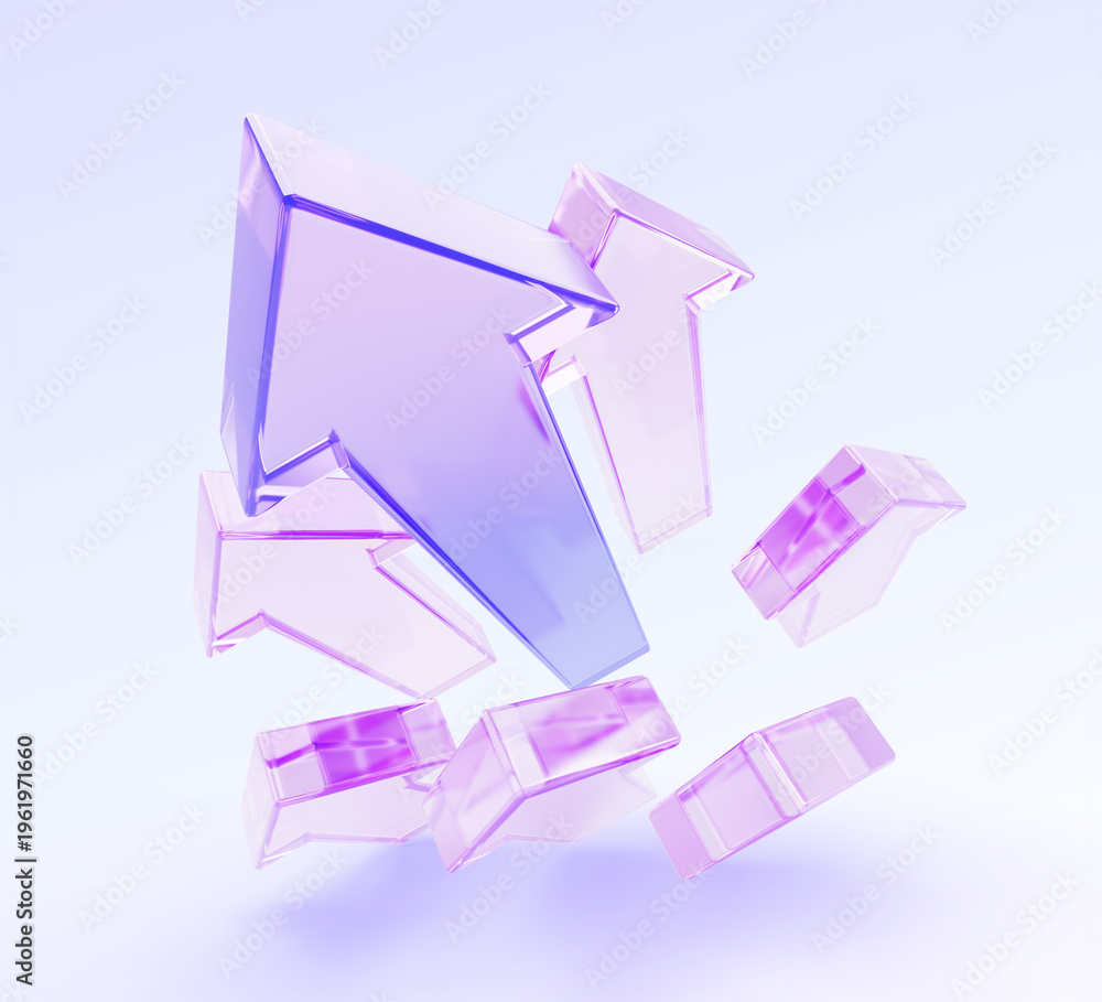 Abstract glass arrows 3D background with holographic gradient. High speed effect up, iridescent transparent triangle lines, top view. Tech innovation, business growth, moving forward. 3D illustration #1961971660