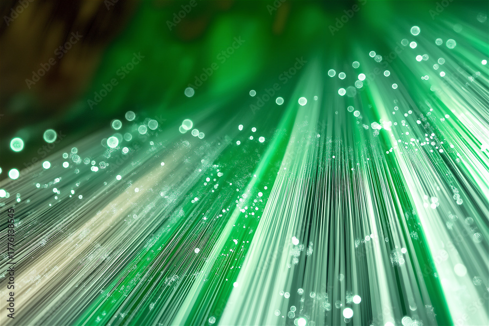 Abstract green fiber optic light trails against dark background creating dynamic technology concept. Glowing strands of light with bokeh effect symbolizing digital communication and connectivity. #1776138545