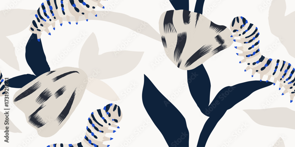 Abstract minimalist flowers with bugs pattern. Cute hand drawn botanical print. Fashionable template for design. #1731921841