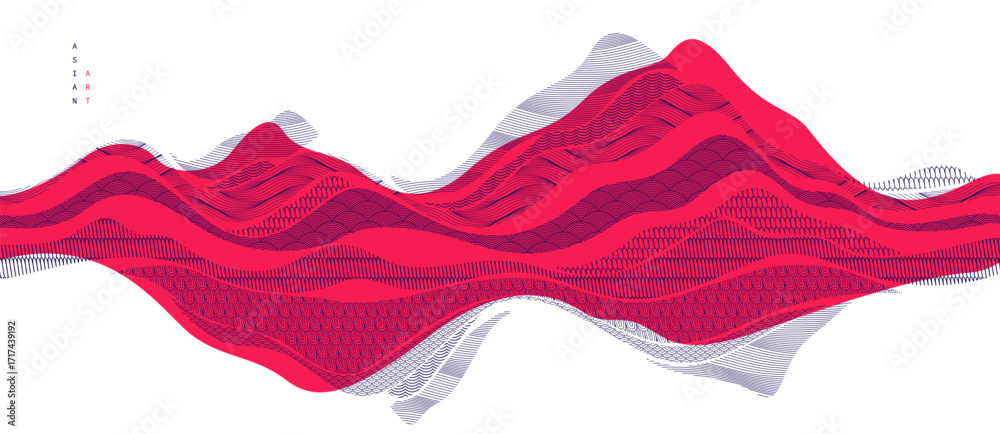 Abstract oriental Japanese art vector background in red color, traditional style design, wavy shapes and mountains terrain landscape, runny like sea lines. #1717439192