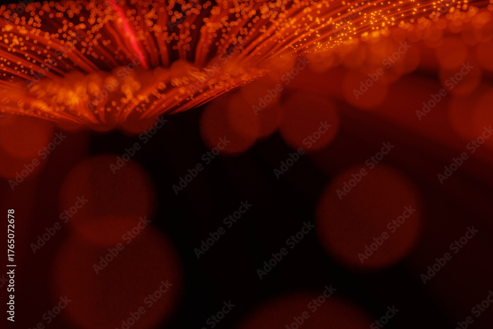 Abstract red bokeh background with glowing fiber optic lights. Futuristic digital technology concept, data transfer, internet communication, or festive light design with warm orange tones. #1765072678