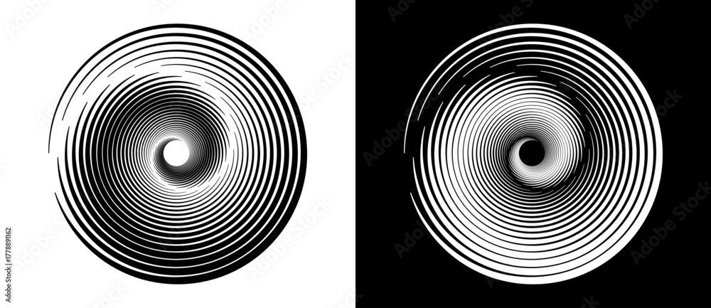 Abstract rotated lines in circle form as background. Design element for prints, logo, sign, symbol and icon. A black figure on a white background and an equally white figure on the black side. #1778891162