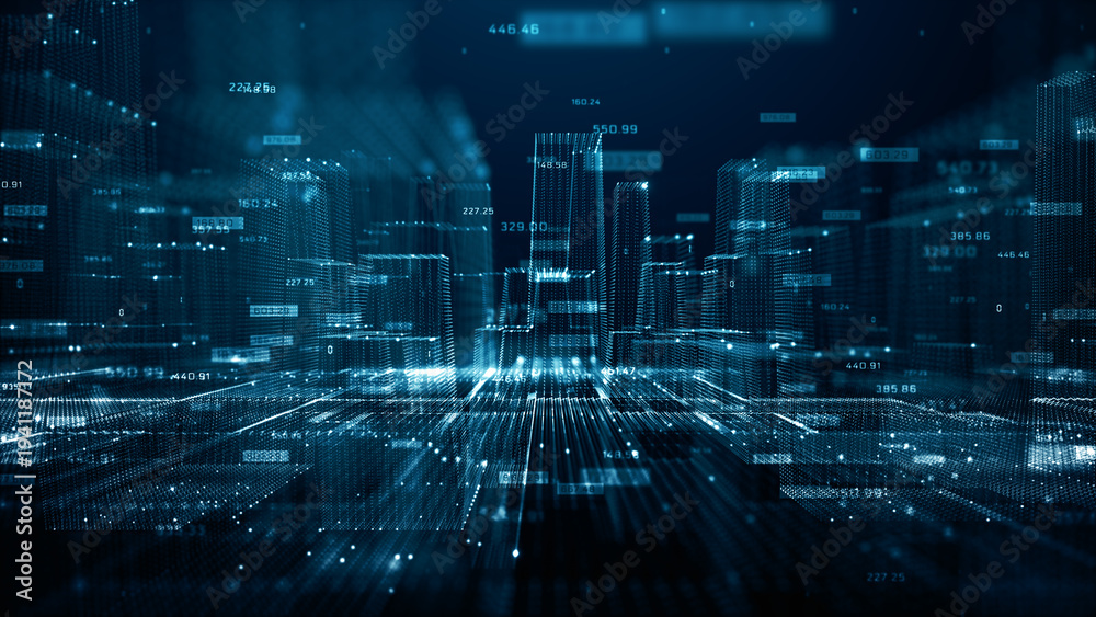 Abstract smart city concept with glowing digital buildings, data streams, and financial analytics overlay. Represents big data, artificial intelligence, IoT connectivity, 3d Rendering #1941187172
