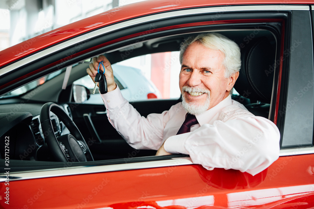 Adult man buy car and holding a key of his new car, looking at camera and smiling. #207127622