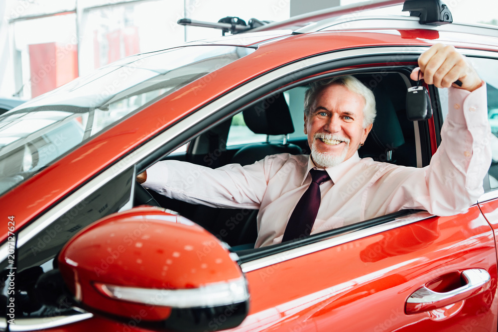 Adult man buy car and holding a key of his new car, looking at camera and smiling. #207127624