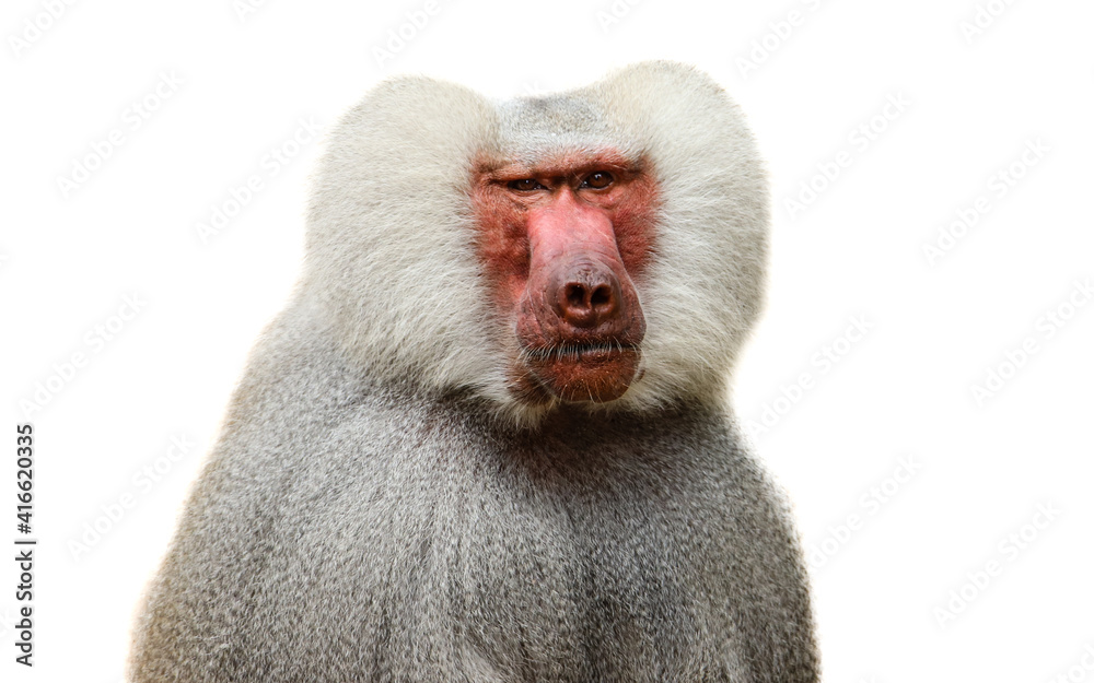 Adult old baboon monkey (Pavian, Papio hamadryas) close face expression observing staring vigilant looking at camera isolated on white background. Hairy adult baboon with silver grey hair. #416620335