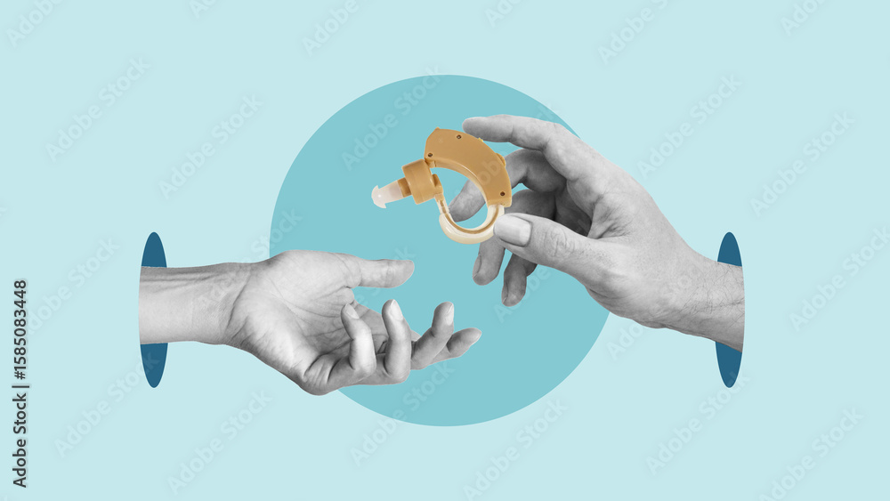 Advanced technology aiding communication for those with hearing difficulties are shown by hands with a small hearing device #1585083448