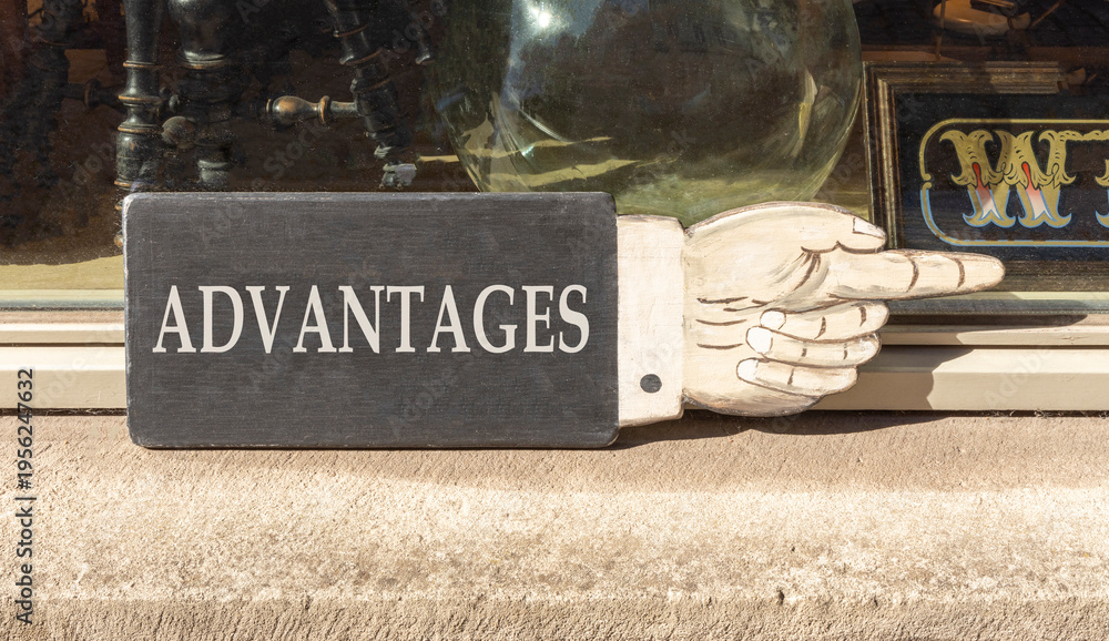 Advantages symbol. Concept word Advantages on beautiful black wooden sign as a hand. Beautiful store front background. Business advantages concept. Copy space. #1956247632