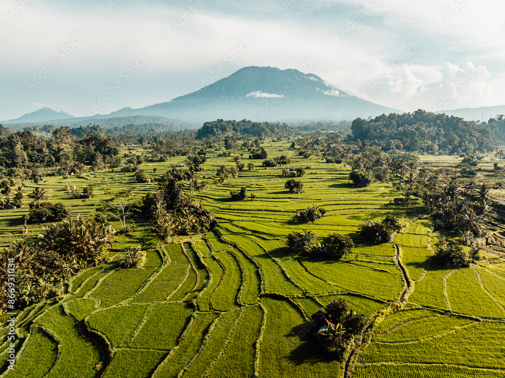Aerial image of morning golden hour over rice fields and look at mount Agung in Sidemen, Bali, Indonesia #866931034
