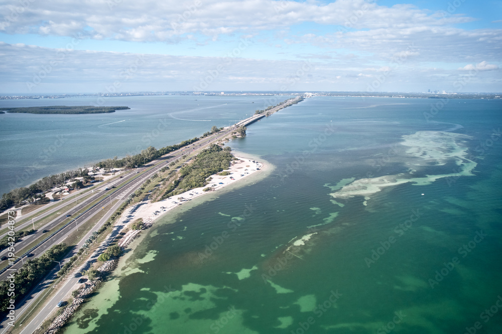 Aerial image of the highway leading up to the Sunshine Skyway Bridge over Tampa Bay linking Pinellas and Manatee County with a small white sand beach pullout for kayakers and boaters #1954204873