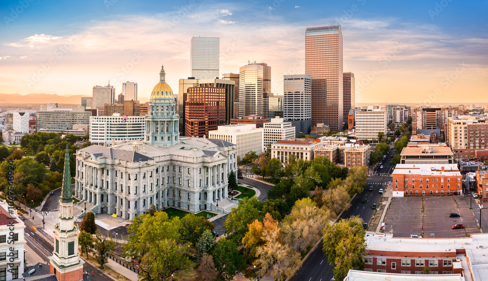 Aerial view of Colorado Capitol and Denver, Colorado skyline at sunset. Denver is a consolidated city and county, the capital, and most populous city of the U.S. state of Colorado #1047548924