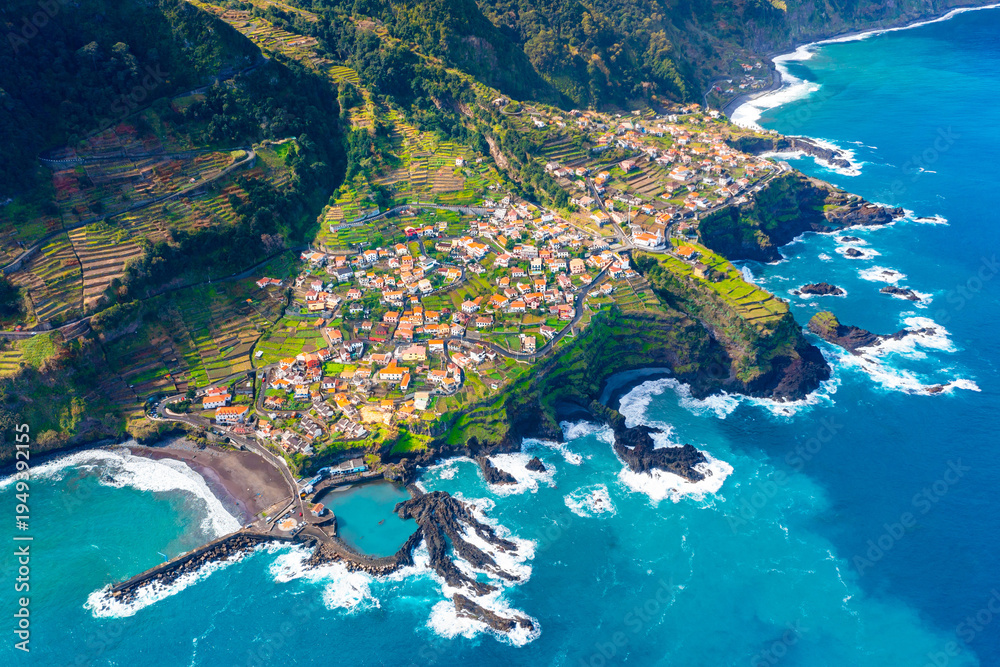 Aerial view of Madeira island. Land meets ocean in Seixal, Madeira, Portugal #1949392155