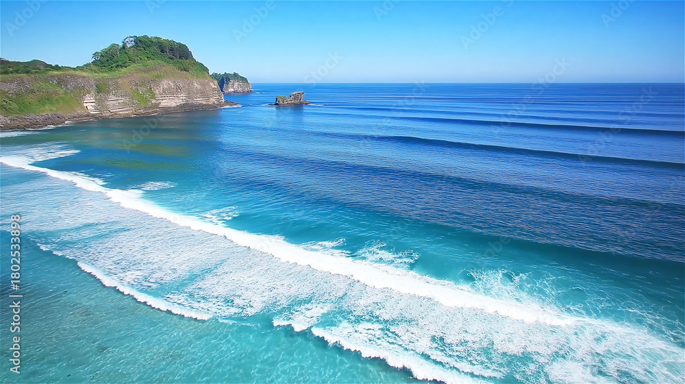 Aerial view of ocean waves breaking on sandy beach with small island in distance. Perfect surfing spot showcasing blue water meeting pristine shore. #1802533898
