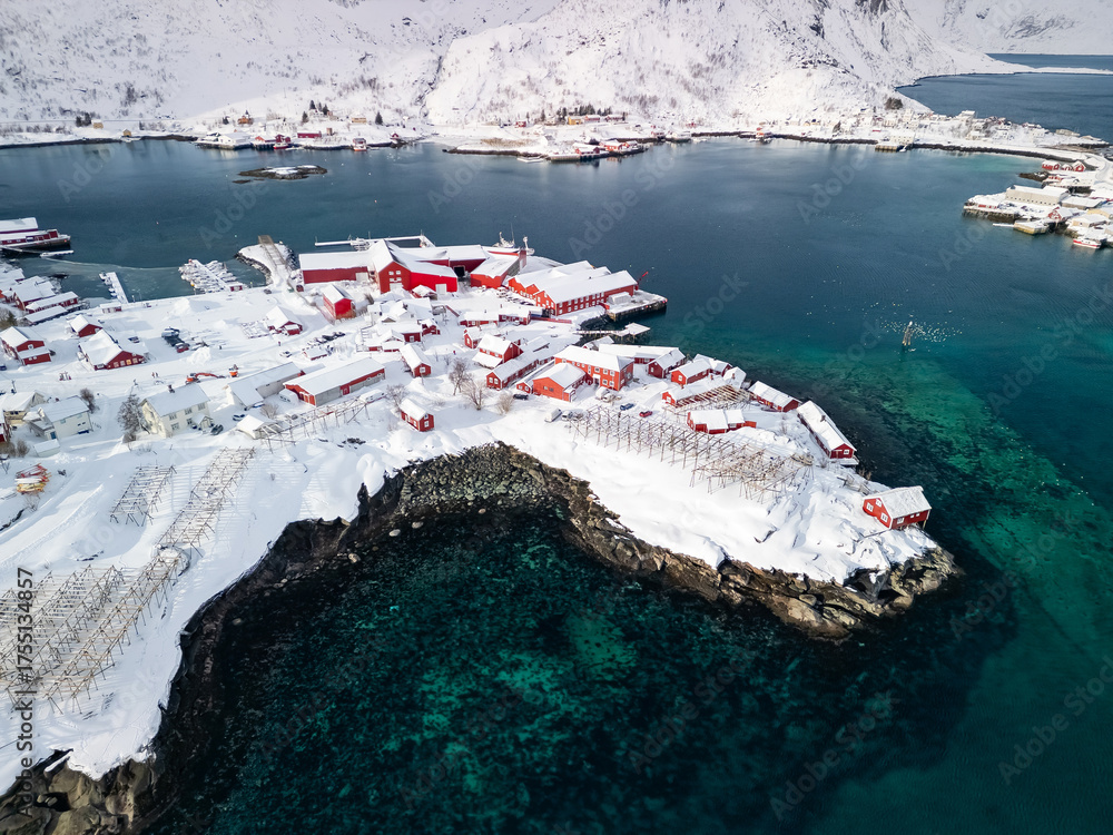 Aerial view of Reine fishing village in winter. Typical red cabins in the landscape of northern Norway. #1755134857