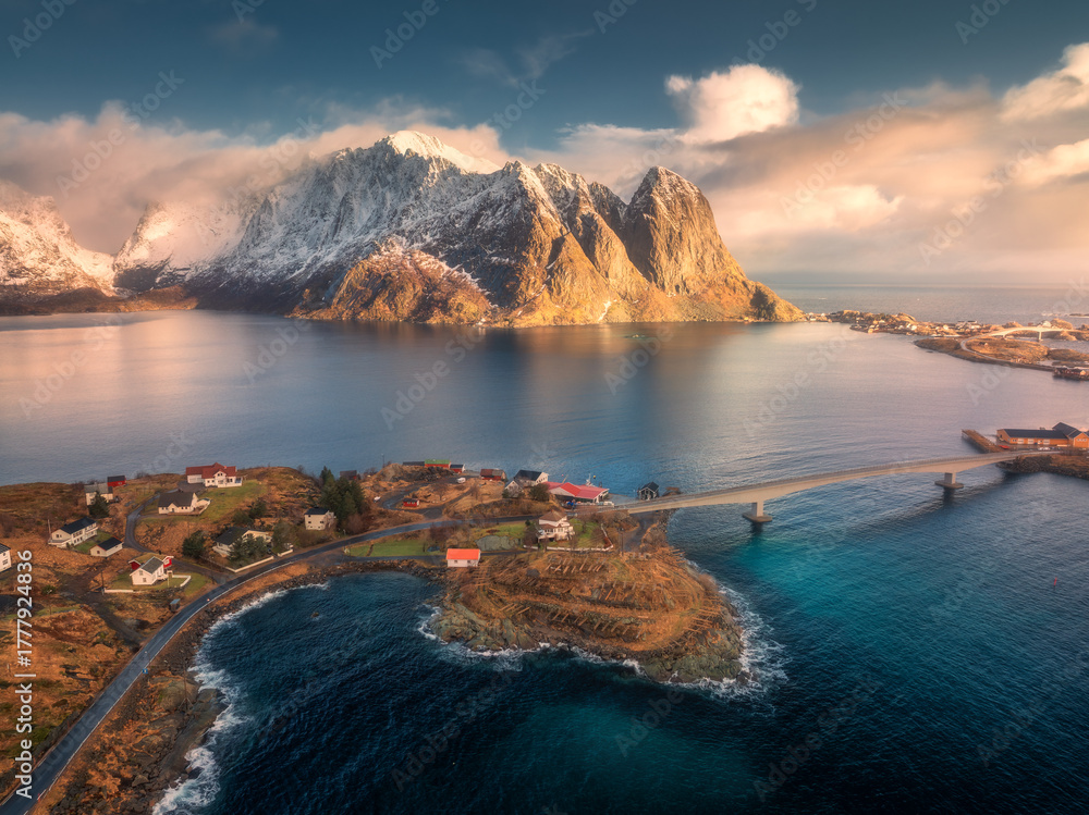 Aerial view of Reine village surrounded by fjords and snowy mountains in Lofoten, Norway. Bright winter sunlight over fishing cabins, blue sea, and dramatic coastal landscape. Top drone view #1777924836