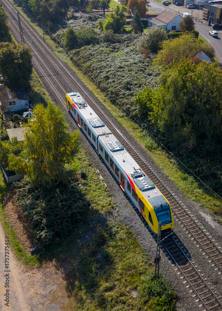 Aerial view of the regional train traveling through the countryside #1757375459