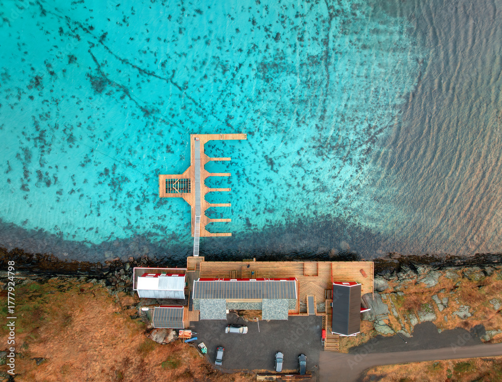 Aerial view of wooden pier, beach, transparent azure water, houses on the sea coast in summer. Sakrisoy, Lofoten islands, Norway. Top down view from drone of sea, jetty, rorbuer, orange grass. Nature #1777924798