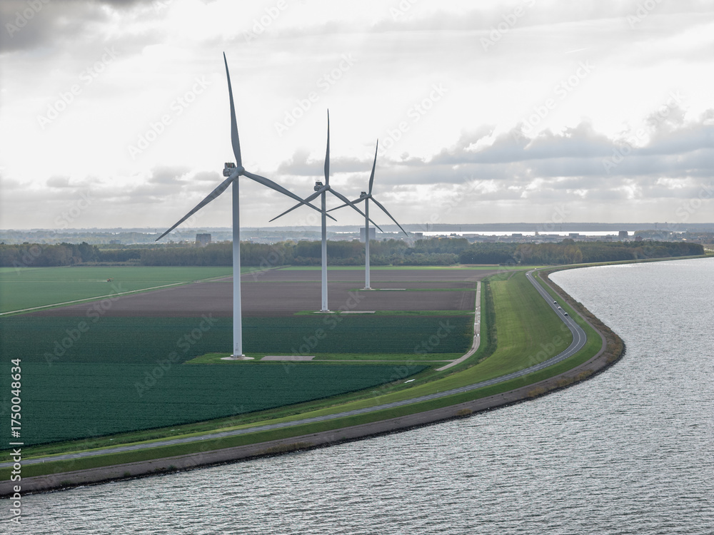 Aerial view on energy farm with wind mills generating sustainable green electricity in Flevoland, the Netherlands #1750048634