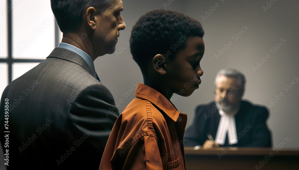 African American boy standing with his attorney inside a juvenile courtA Juvenile Defense Attorney specializes in defending children who find themselves in legal trouble #744593860