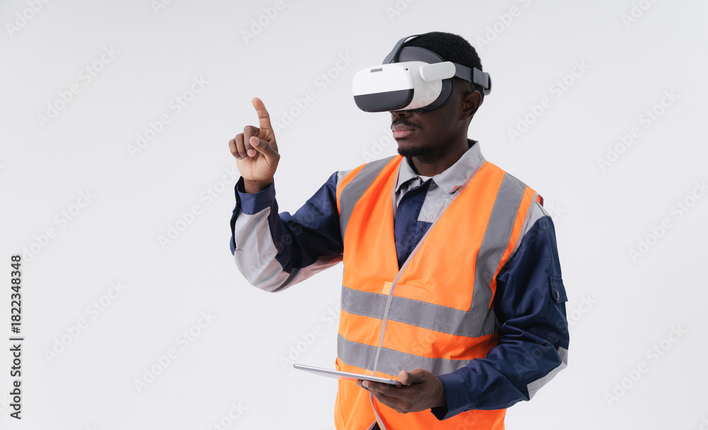 African male adult engineer with tablet computer using vr headset for virtual training in safety vest #1822348348