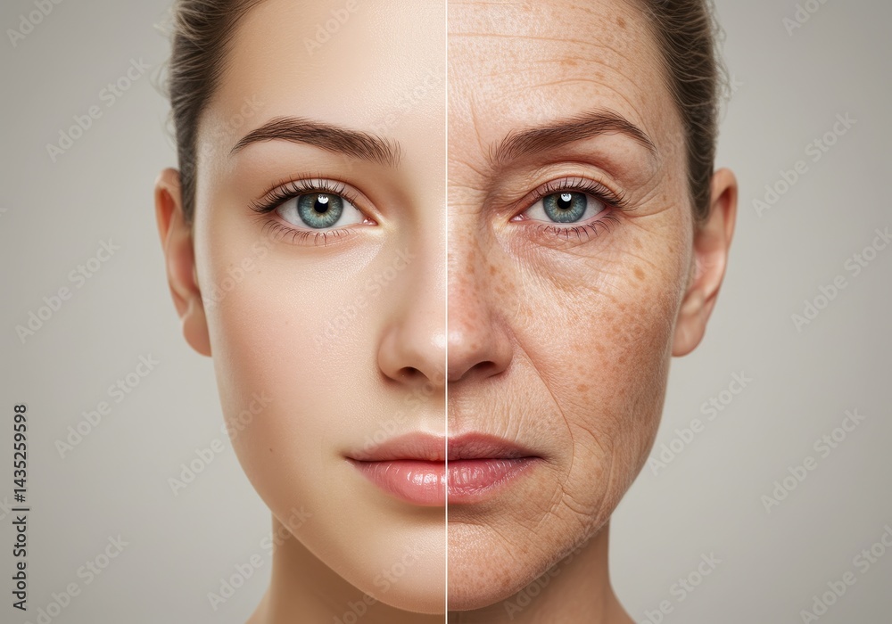 Ageing Skin Comparison: Youthful vs Mature - Split face showing the contrast between youthful and mature skin, highlighting the effects of aging. Ideal for skincare, anti-aging, and cosmetic products #1435259598