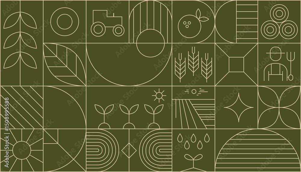 Agriculture abstract modern line geometric pattern. Vector eco farming and green energy background with linear plants, sprouts and leaves, water waves, flowers, light bulb and sun, windmill. #1508995588