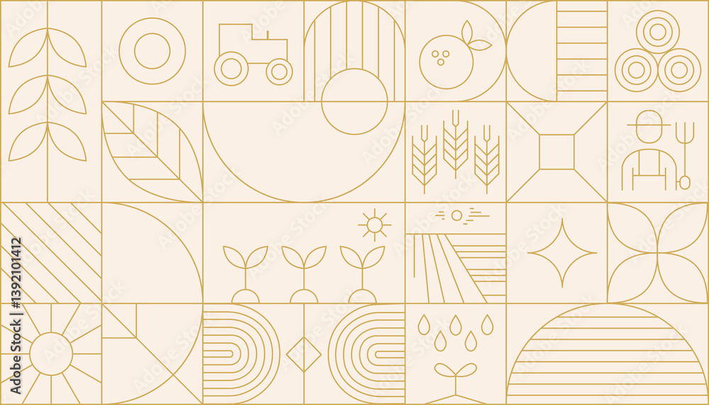 Agriculture abstract modern line geometric pattern. Vector eco farming and green energy background with linear plants, sprouts and leaves, water waves, flowers, light bulb and sun, windmill or tree. #1392101412