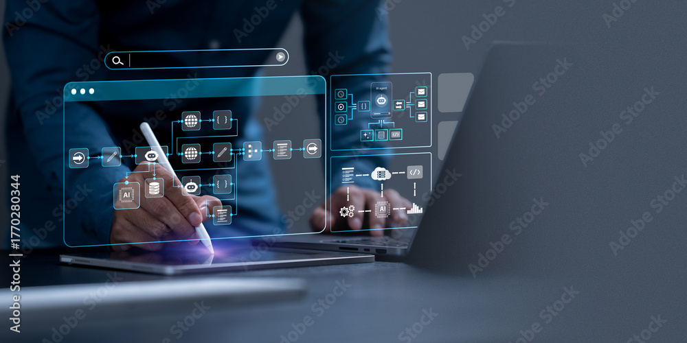 AI automation workflow diagram, artificial intelligence software interface nodes triggers data tool dashboard coding icon flow process technology. Ai agent and process flow on digital code background. #1770280344