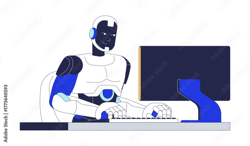 AI robot using computer for office work 2D cartoon character. Digital workspace. Artificial intelligence at desk, typing keyboard flat vector personage isolated on white. Spot illustration colorful #1773640593