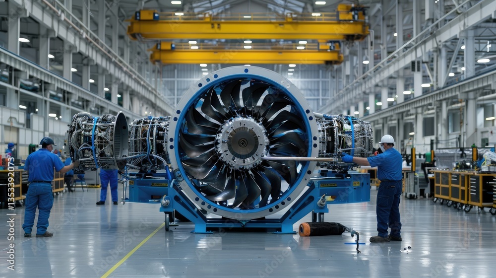Aircraft engine component assembly takes place inside a large factory #1353392073